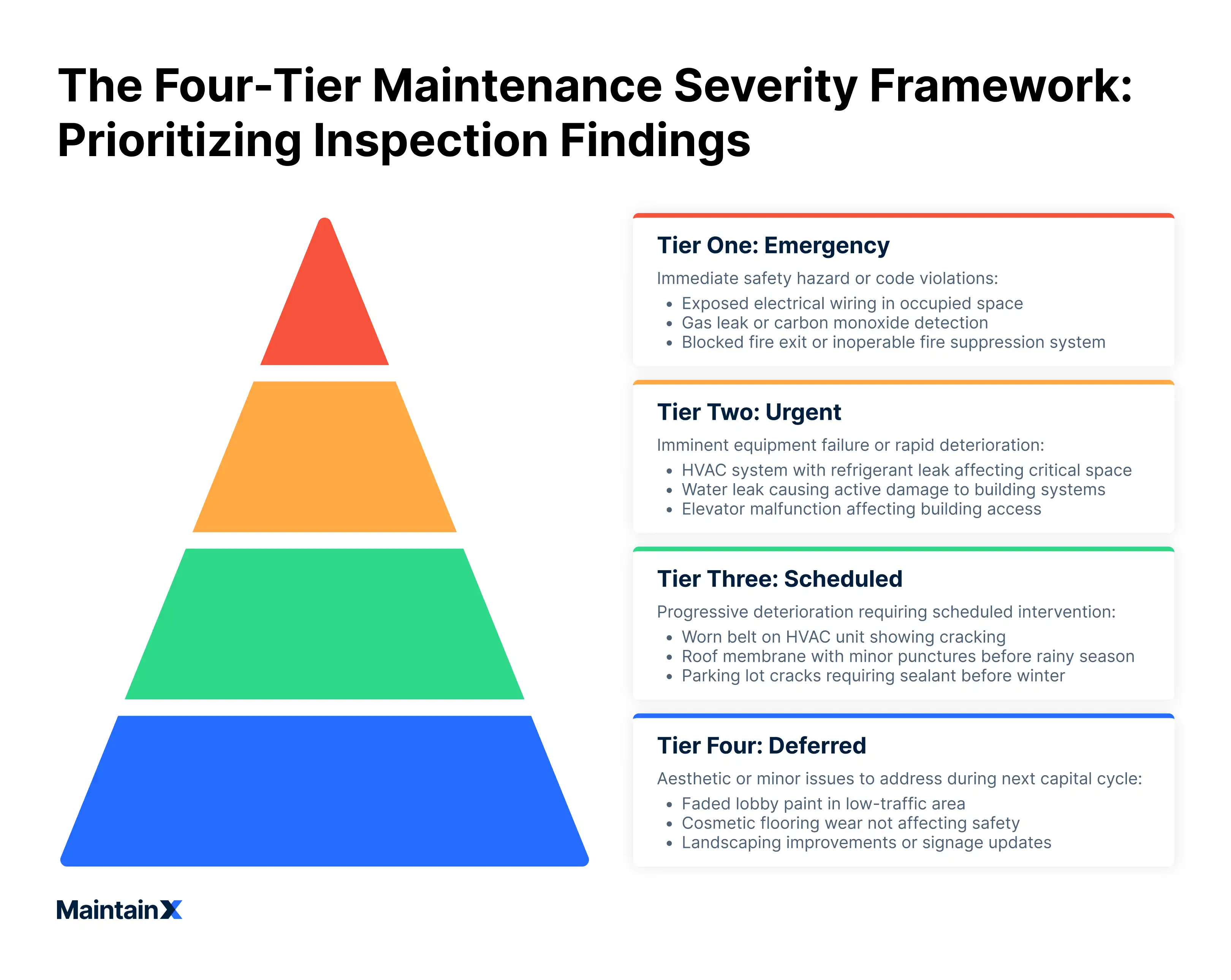 Effective facility management programs define clear severity tiers during the inspection itself. For example, tagging each finding as either critical (immediate action), high (within 24 hours), medium (this week), or low (scheduled maintenance). A CMMS automates this workflow by letting technicians assign priority levels in the field, instantly routing urgent issues to the right person and scheduling the rest without manual follow-up.