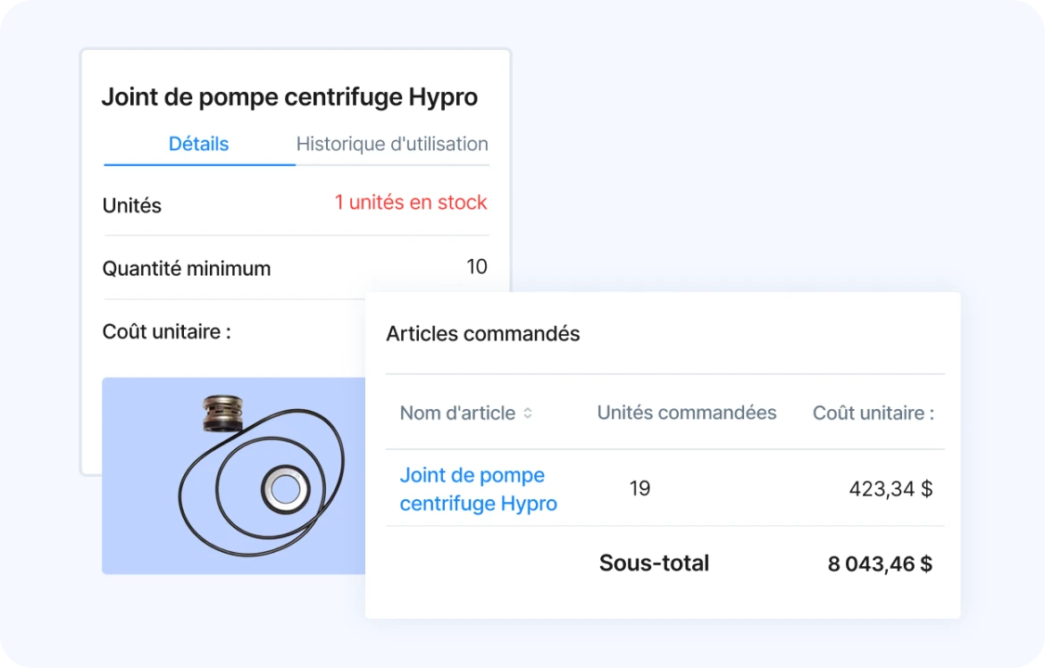 Conservez les pièces essentielles en stock afin que chaque récolte, chaque quart de travail et chaque saison se déroule comme prévu. Obtenez une visibilité complète de votre stock de pièces détachées, partagez les ressources entre les différents sites et optimisez l’ensemble du processus d'approvisionnement.