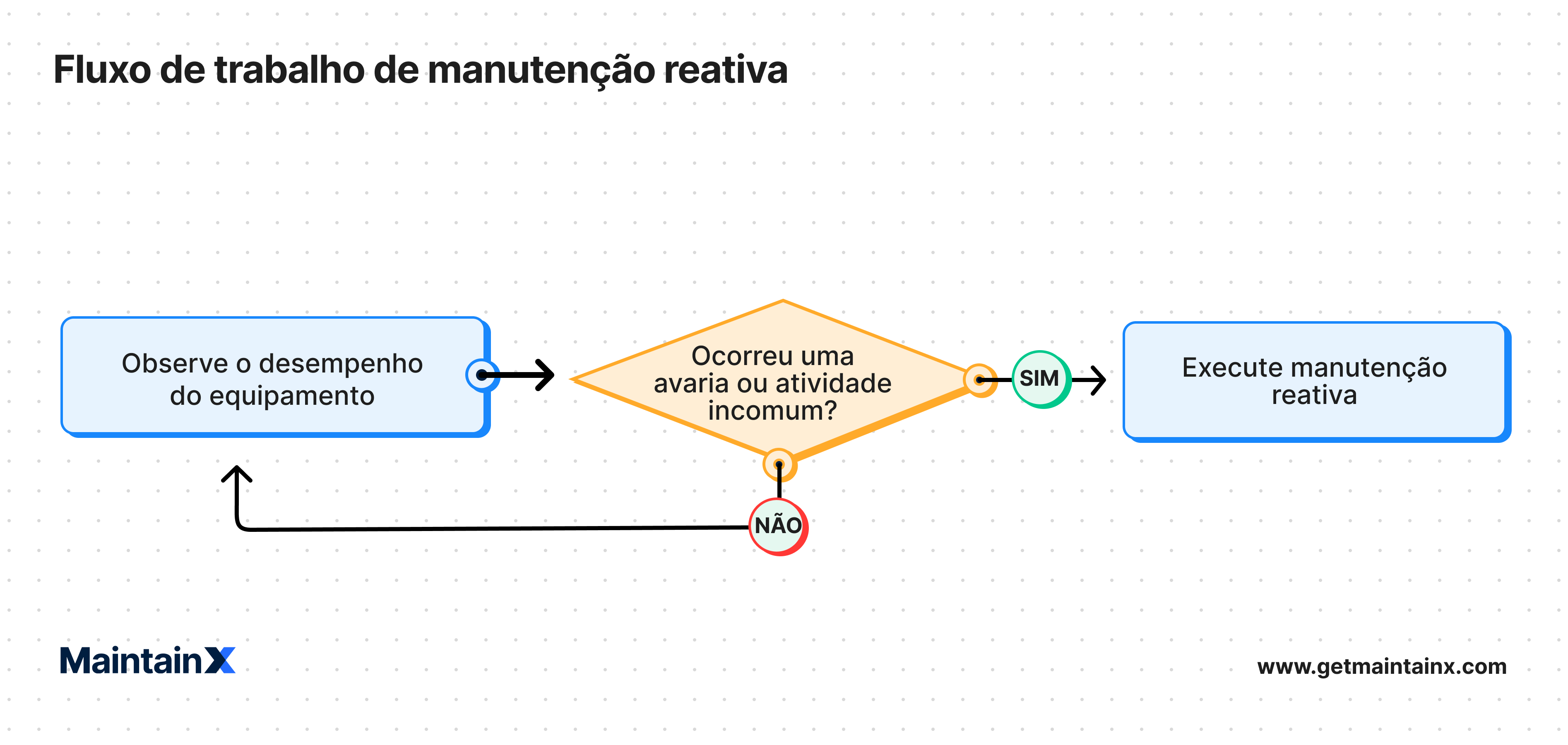 Os SOPs de fluxograma fornecem representações visuais das etapas envolvidas na execução das tarefas. Eles normalmente usam formas conectadas por setas que exibem o fluxo do processo e são úteis para processos complexos que envolvem vários pontos de decisão e caminhos potencialmente ramificados. Os recursos visuais ajudam a orientar o usuário em vários resultados com base em diferentes decisões. Os exemplos incluem fluxos de trabalho de manutenção como os seguintes: