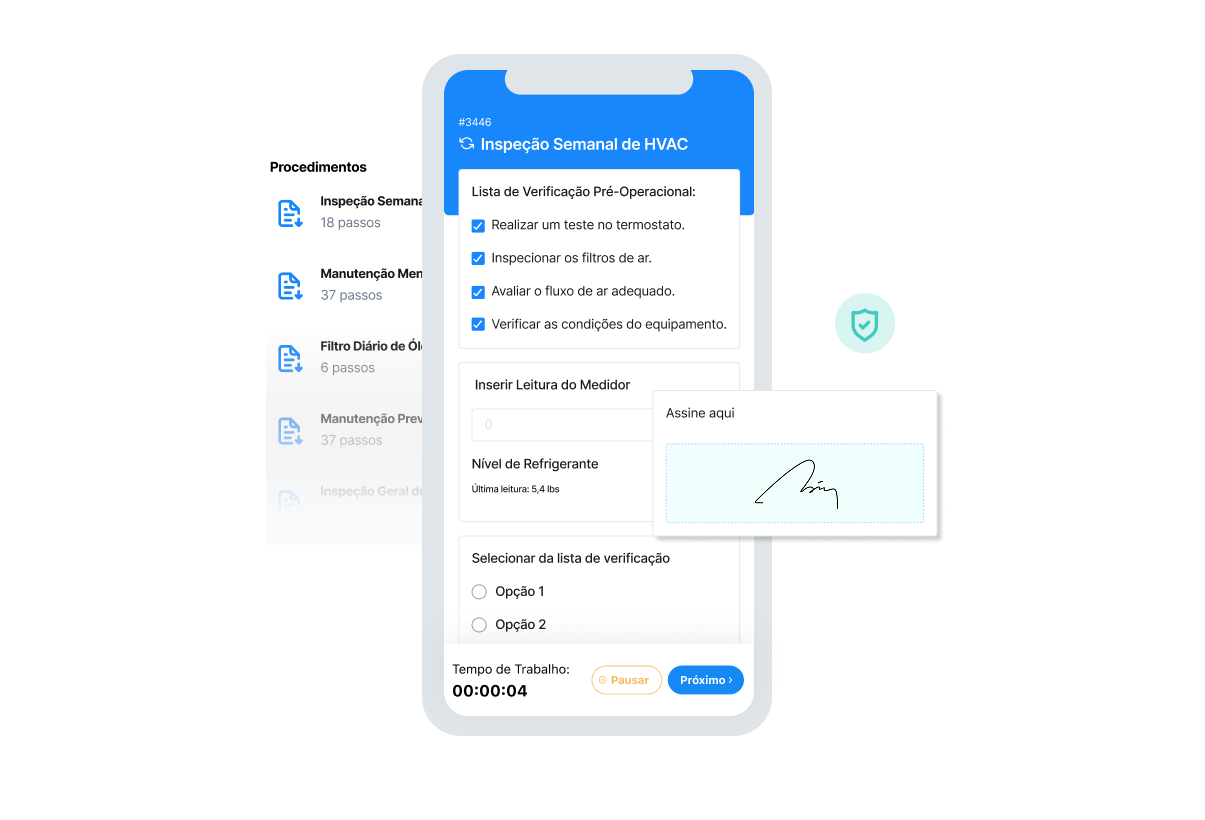 As listas de verificação são SOPs estruturados como uma lista de itens com caixas de seleção anexas. Eles são semelhantes aos formatos hierárquico SOP e passo a passo, mas oferecem o benefício adicional de uma caixa de seleção como auxílio visual para garantir que os usuários se lembrem de todas as tarefas pendentes. Softwares como um sistema computadorizado de gerenciamento de manutenção (CMMS) podem oferecer suporte a listas de verificação digitais, que simplificam seu trabalho ao permitir que você compartilhe atualizações em tempo real. Em alguns casos, as listas de verificação digitais também podem criar uma camada extra de verificação. O MaintainX, por exemplo, é um CMMS que tem o benefício adicional de assinaturas digitais para manter uma trilha de auditoria.